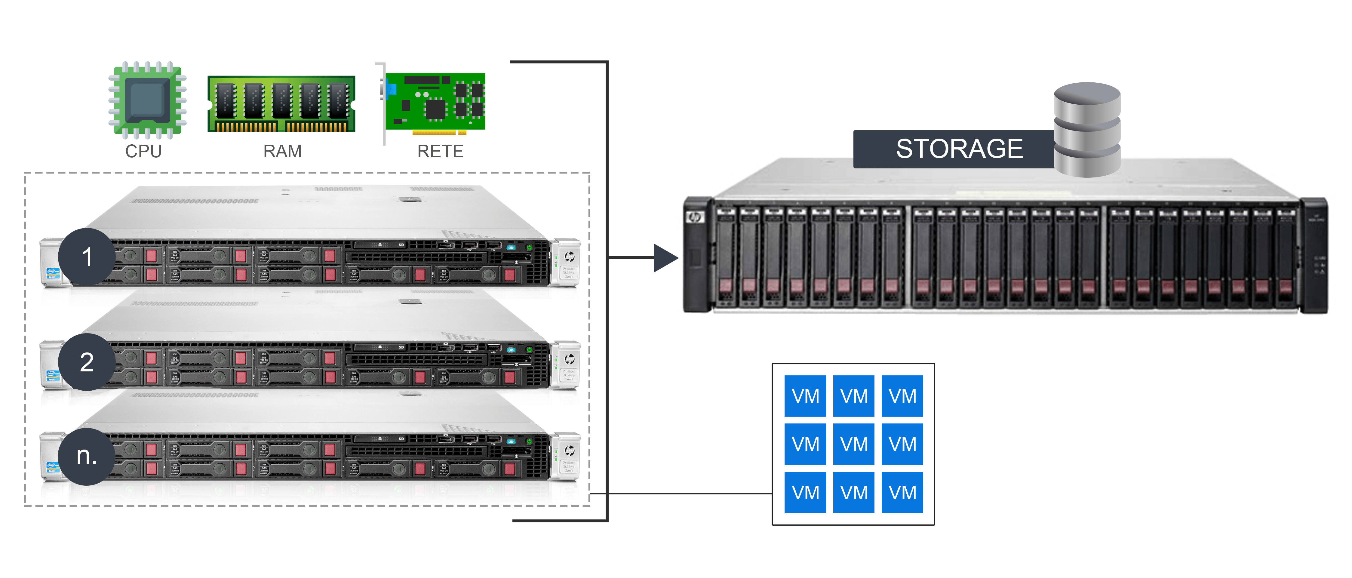 Una VPS è intesa come una VM presente su 1 singolo Host / Hypervisor fisco, sia esso VMware, Hyper-V o KVM.Dal punto di vista fisico la VM risiede sui dischi locali dell'Hypervisor e usa le risorse quali Cpu, Ram e Rete dello specifico Hardware su cui gira.